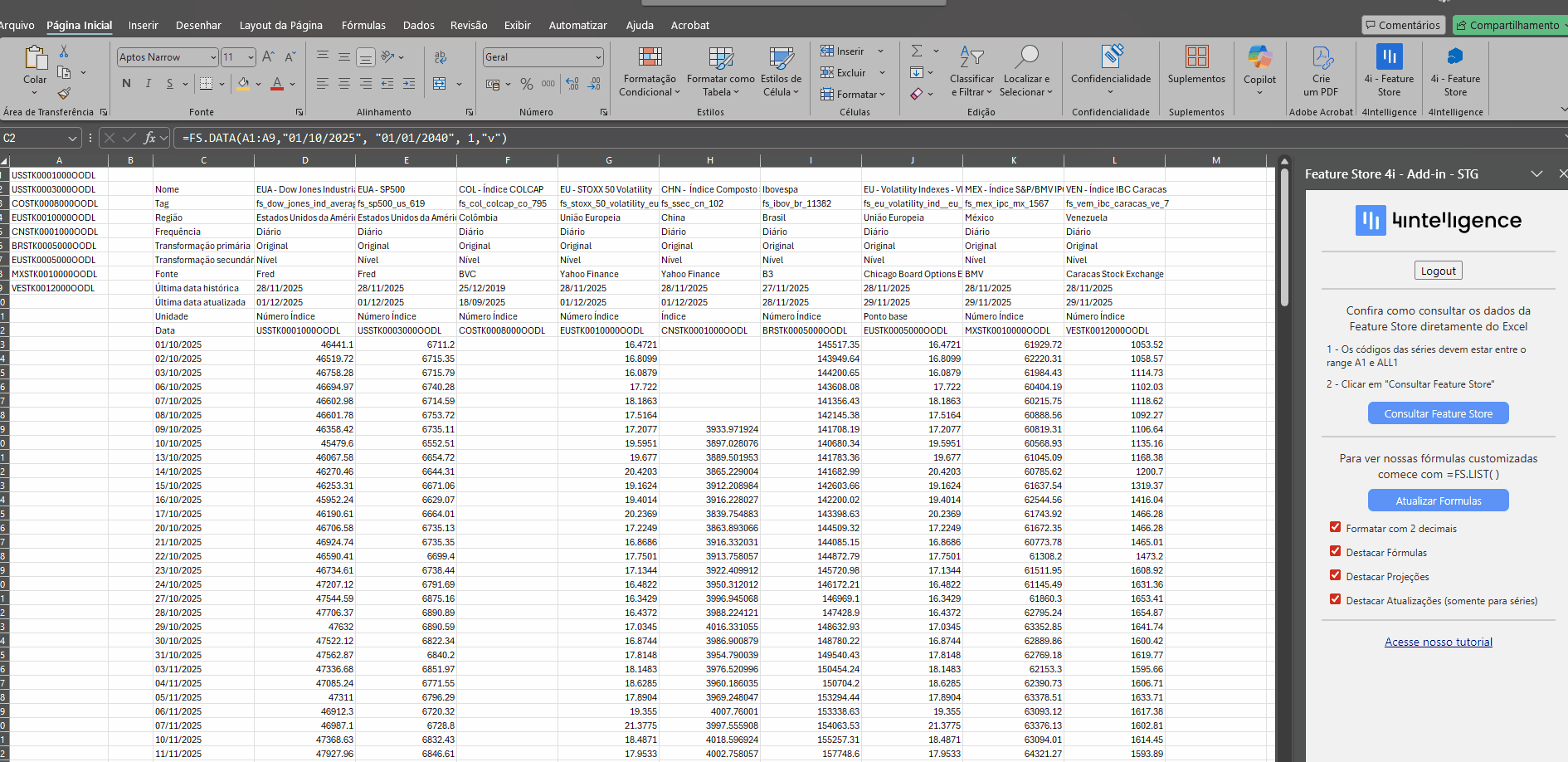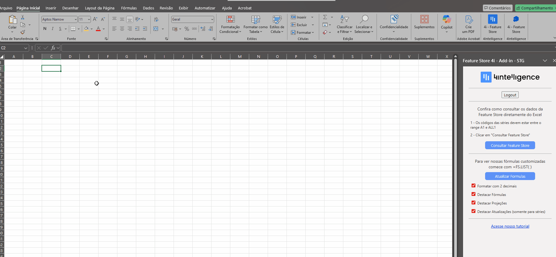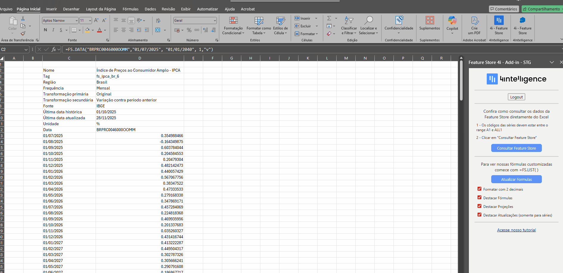 O Excel Add-in da Feature Store é a ponte direta entre a sua ferramenta de trabalho diária e o universo de dados da 4intelligence. Ele permite acessar, consultar e atualizar indicadores econômicos e séries temporais diretamente nas células do Excel, sem a necessidade de navegar pela plataforma web ou realizar processos manuais de "copiar e colar"