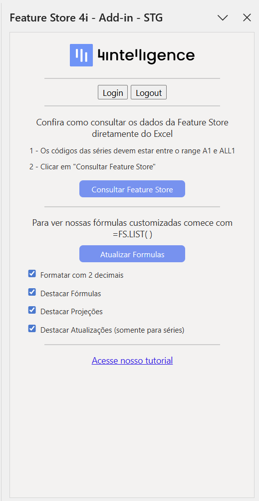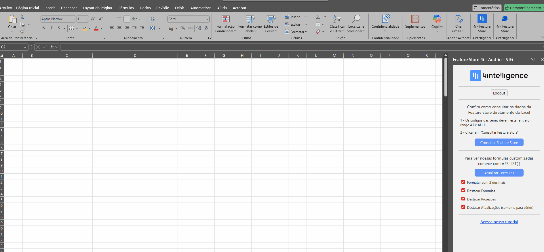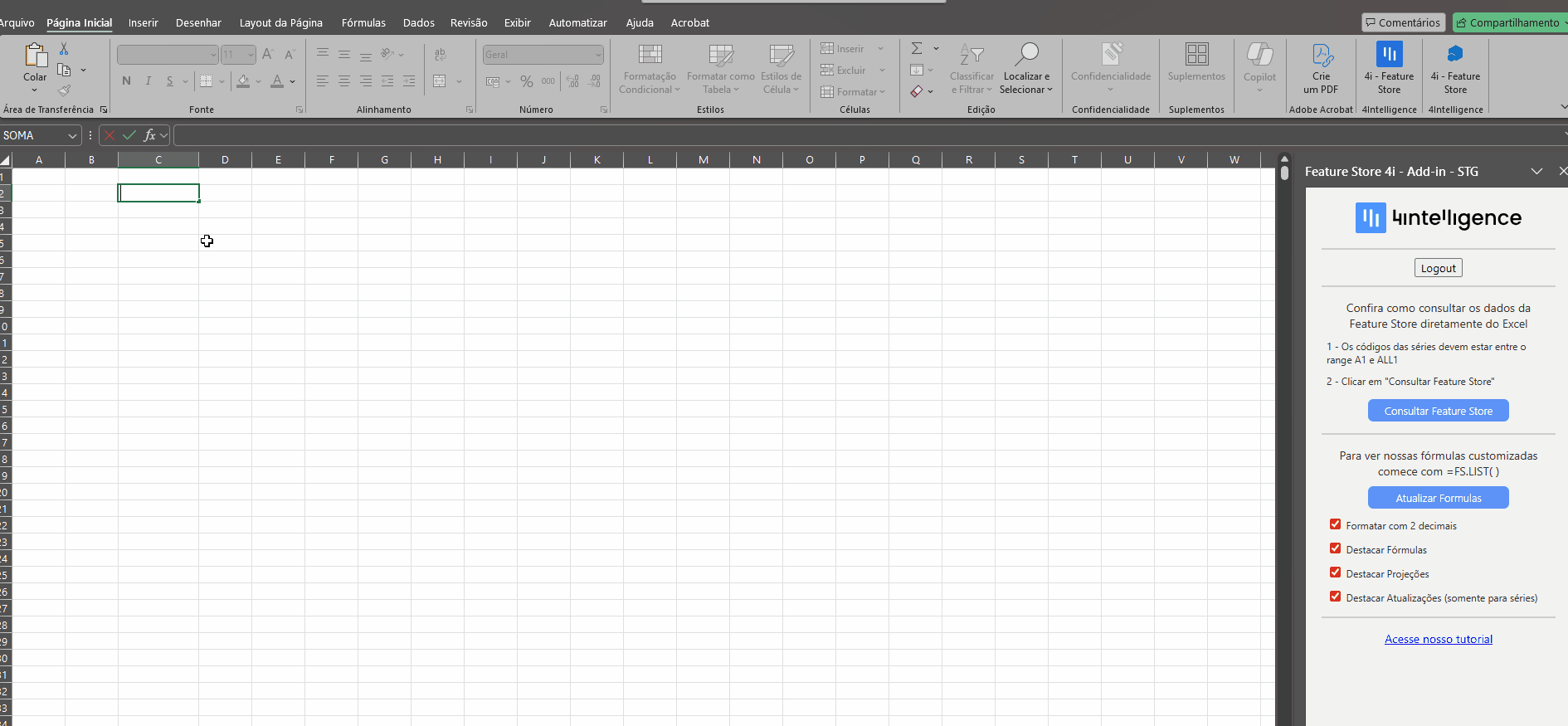 O Excel Add-in da Feature Store é a ponte direta entre a sua ferramenta de trabalho diária e o universo de dados da 4intelligence. Ele permite acessar, consultar e atualizar indicadores econômicos e séries temporais diretamente nas células do Excel, sem a necessidade de navegar pela plataforma web ou realizar processos manuais de "copiar e colar"
